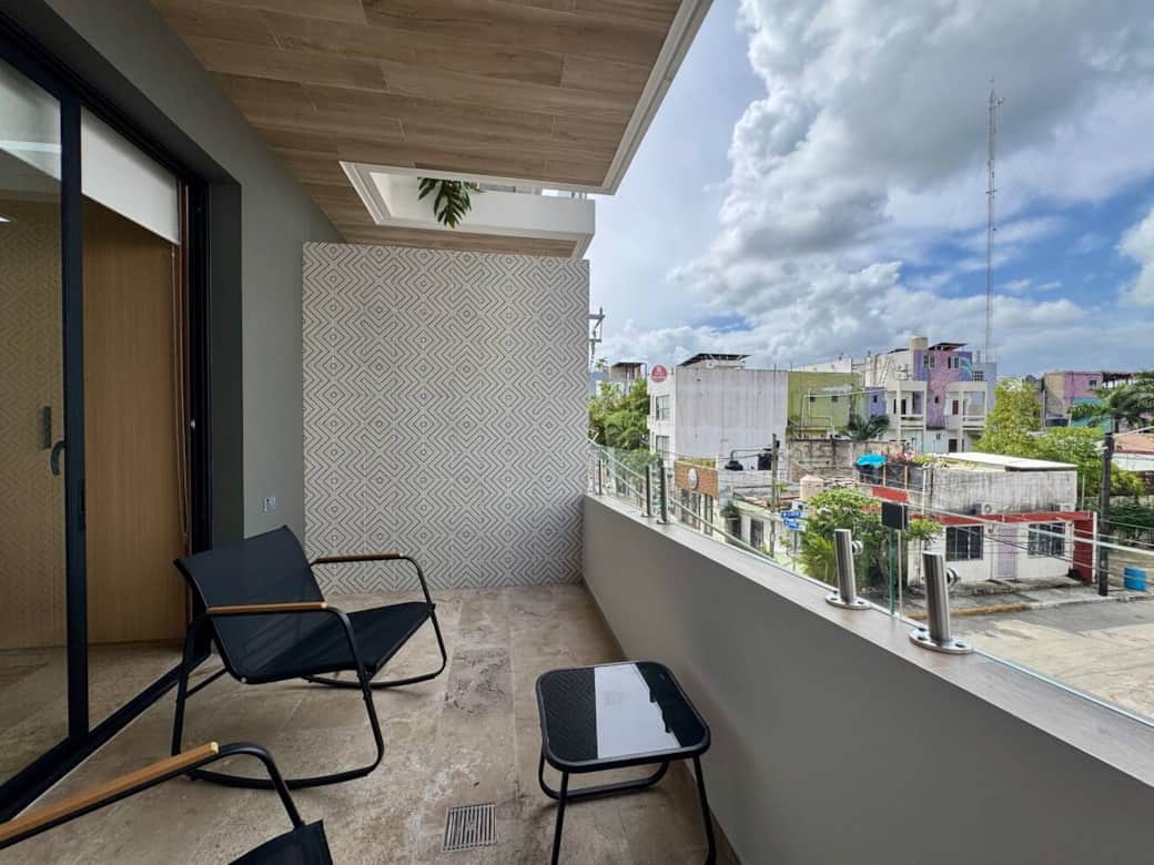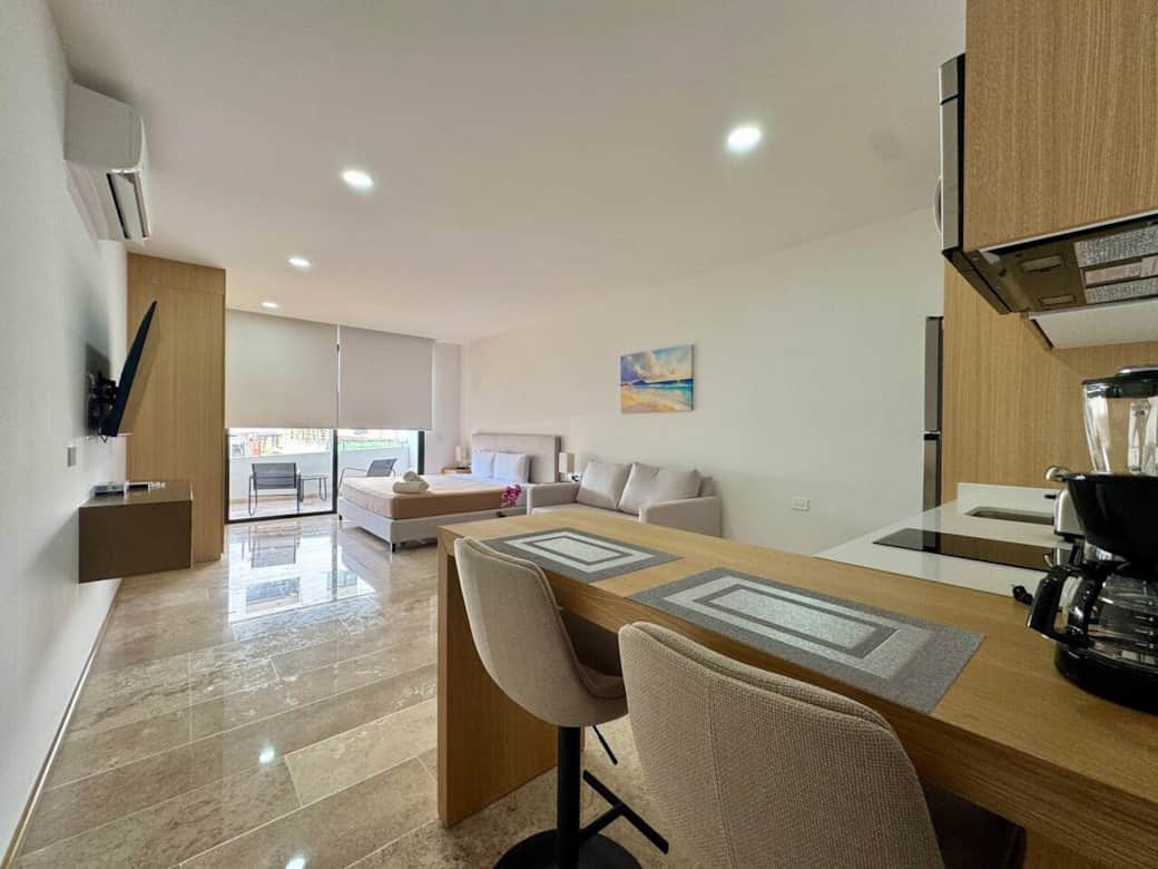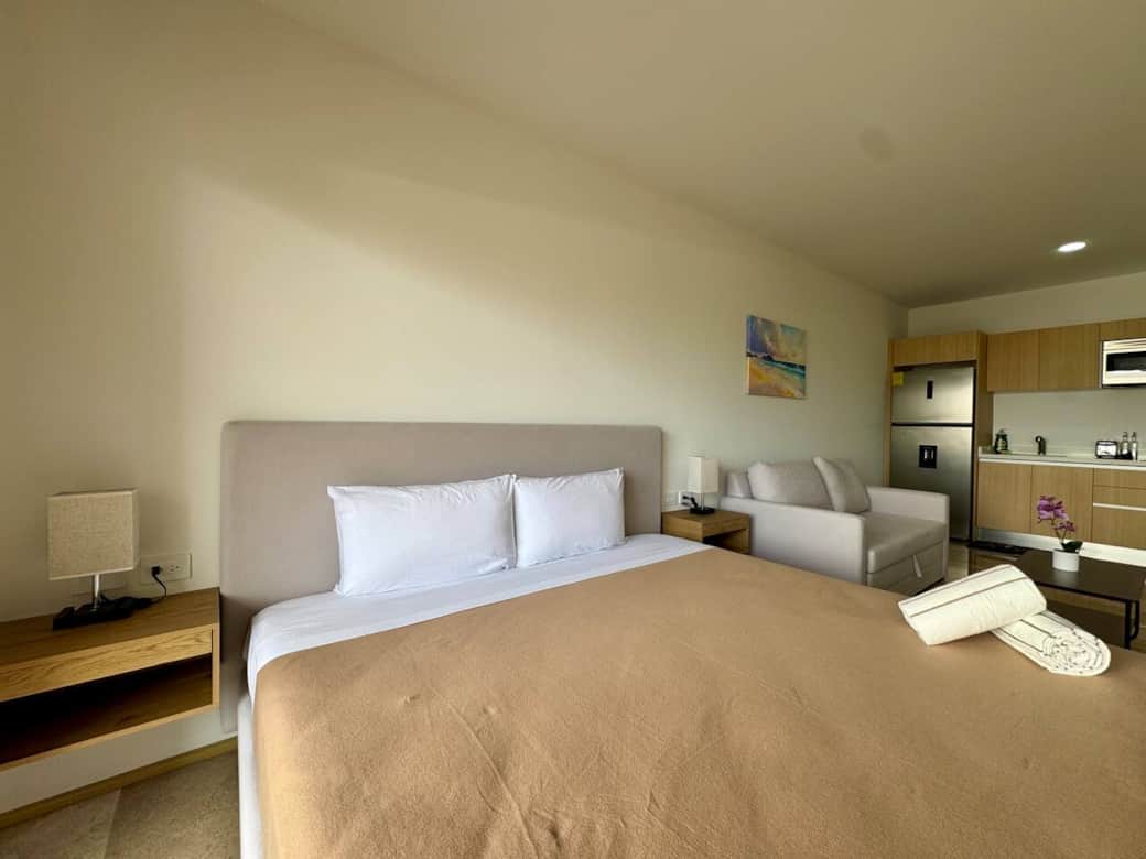 Estudio con balcón, con vista a la calle, cama King Size y sofá cama.