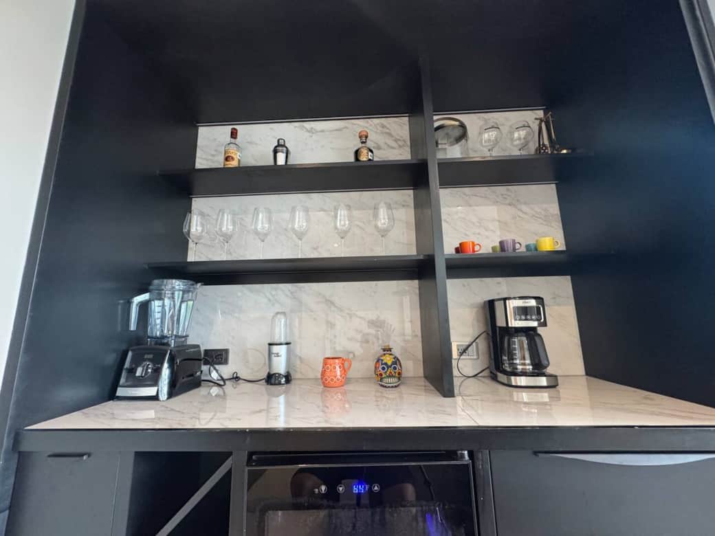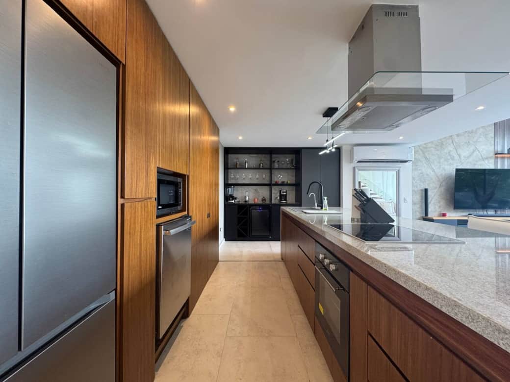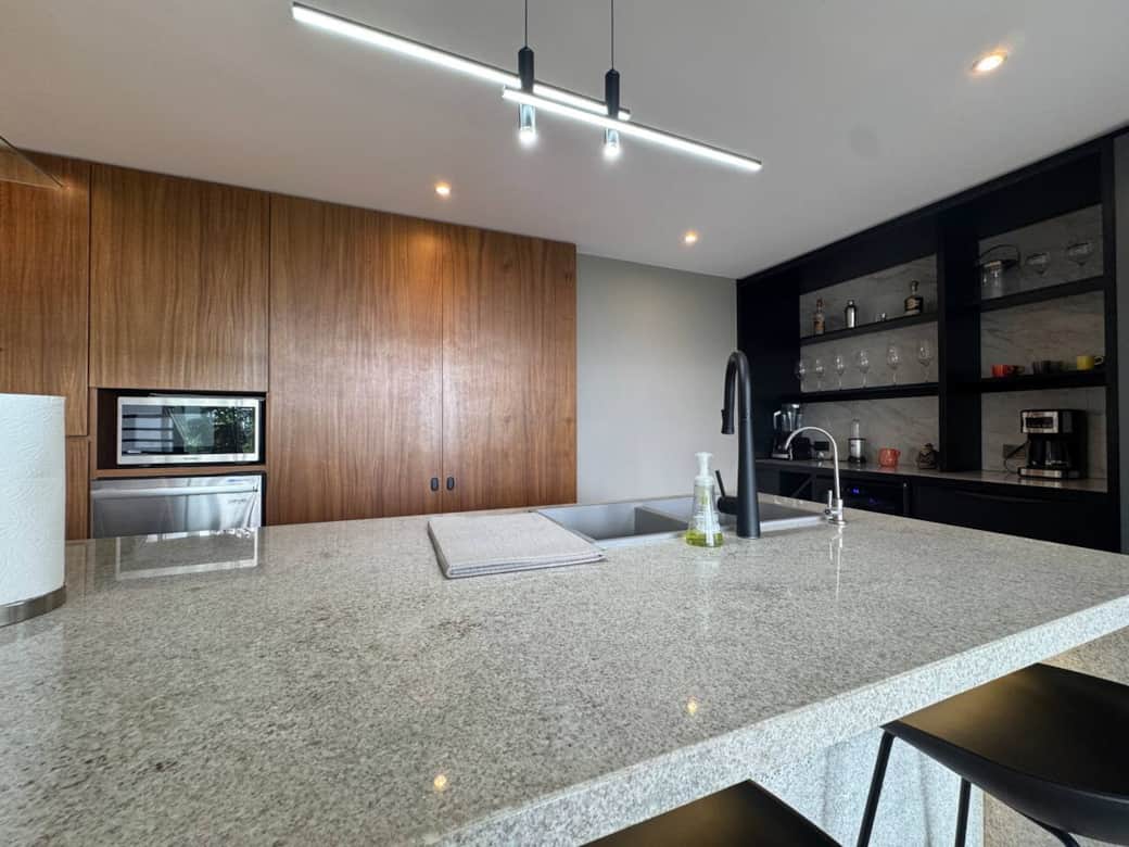 - Seguido tenemos la cocina, con una isla comedor de gran tamaño, un área de bar con enfriador de vinos, licuadora tipo Ninja, cafetera, copas de vino, lavavajillas, lavadora y secadora. Cocina totalmente equipada, con horno y parrilla eléctrica. Contamos con algunas bebidas a la venta que encontrarás en el área del bar.