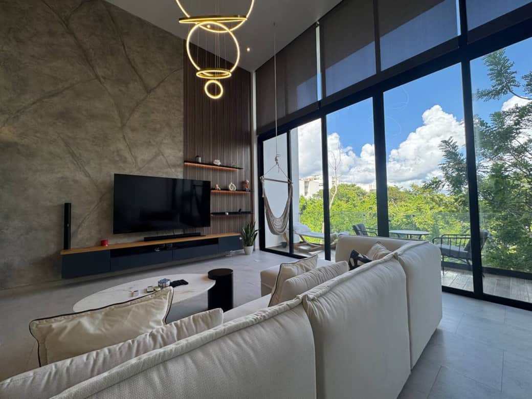 Una gran estancia con un sofá muy cómodo y una TV de gran tamaño con barra de sonido, ventanales de doble altura que lo hacen luminoso, un área de bar con licuadora tipo ninja.